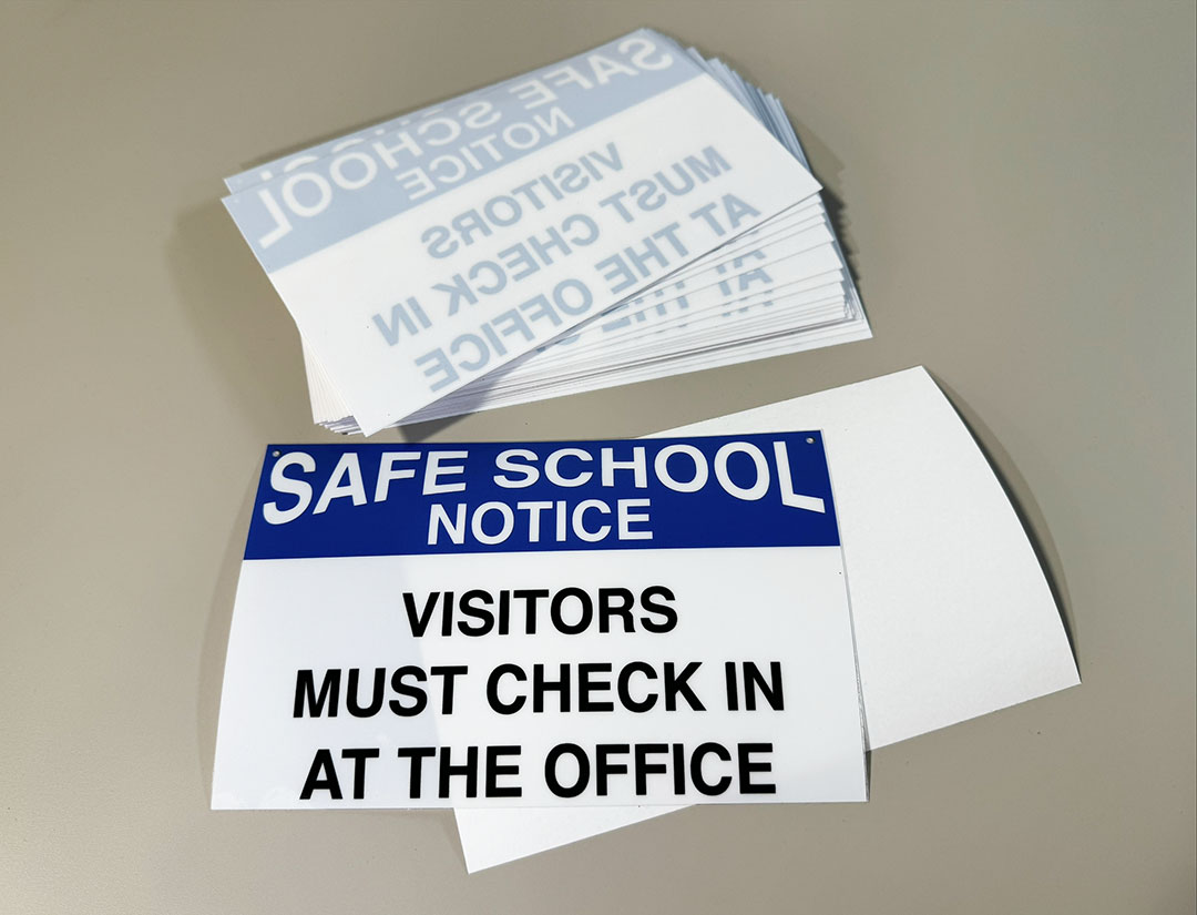 Face Adhesive Vinyl Stickers install inside of a window and show outwards (like a parking pass or inspection sticker) on a vehicle. The printing is on the same side as the adhesive.