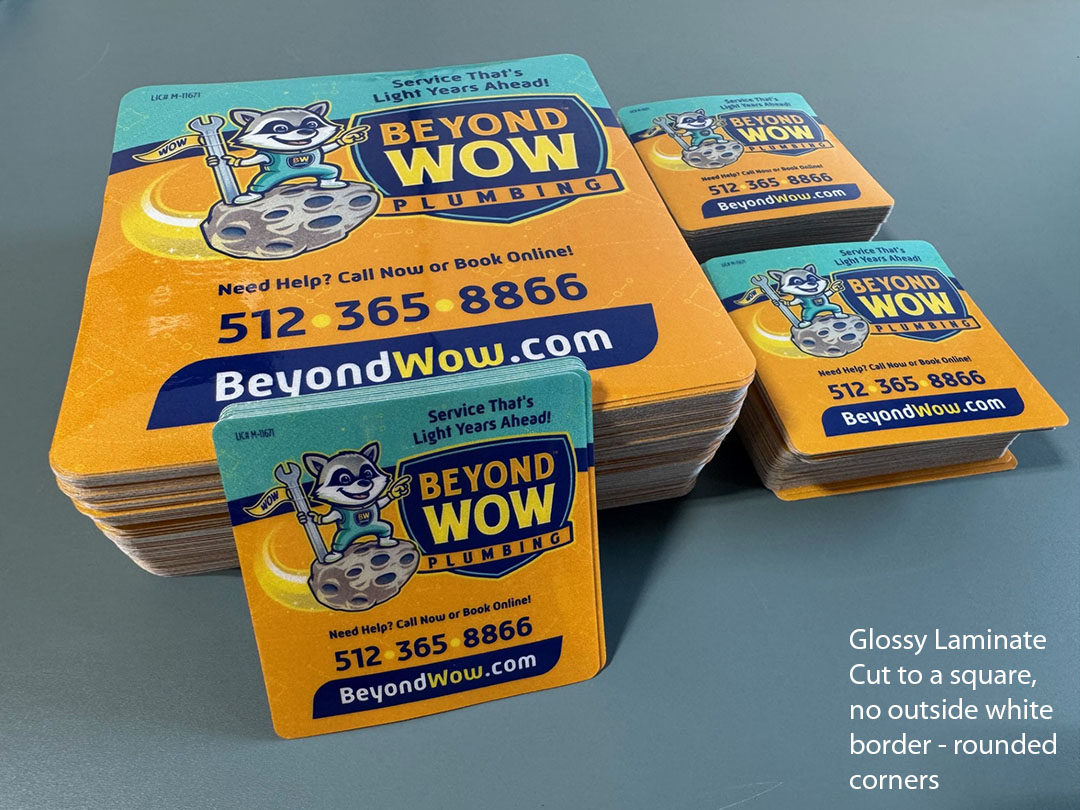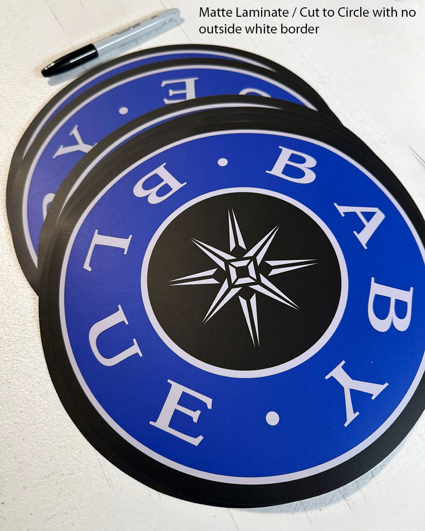 Precision Cutting: Our Digital “no-die” precision cutting follows your exact artwork cut path for any custom size and shape. We can use the cut line in your vector file or we can draw in the cut line for you at no cost. You tell us the look you prefer when receiving your Free Quote and we’ll handle the rest!